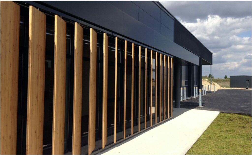 Les façades des bureaux sont très largement vitrées. Une double façade composée par un alignement de lames verticales, orientables comme des volets, vient protéger et apporter un côté rassurant aux bureaux. L’atelier est un grand volume métallique sombre et sobre. Un auvent fait le lien entre les deux volumes.
