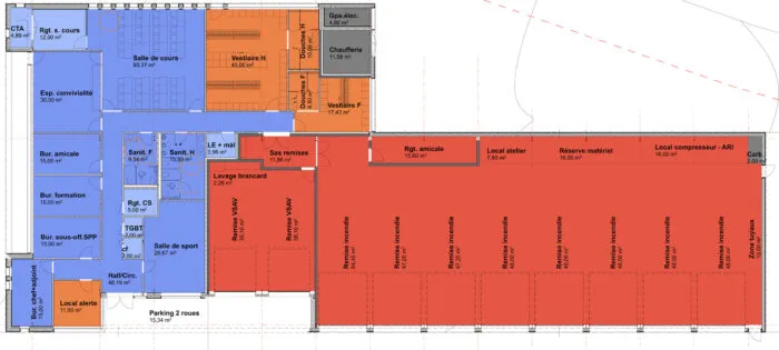 Le nouveau Centre de Secours, classé en code du travail, inclut une zone bureaux, comprenant des espaces de formation, et une zone technique comportant notamment des remises de stationnement des véhicules de secours.