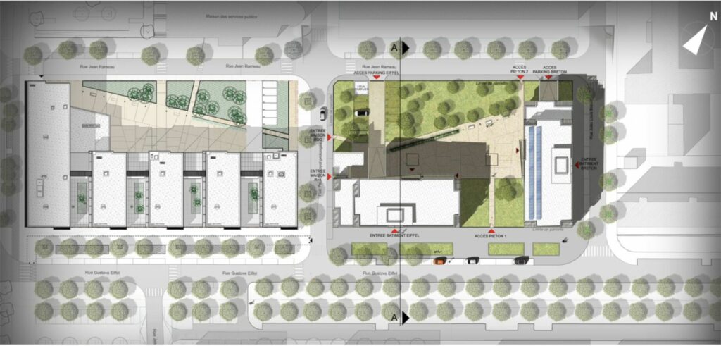 Notre parti est l’étude de 2 bâtiments identiques et compacts décomposés en plusieurs volumes et loggias couvrant 1 parking souterrain et discret, dégageant ainsi des espaces extérieurs de qualité.