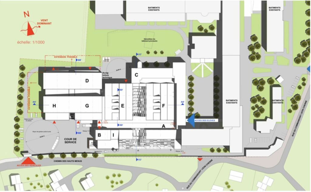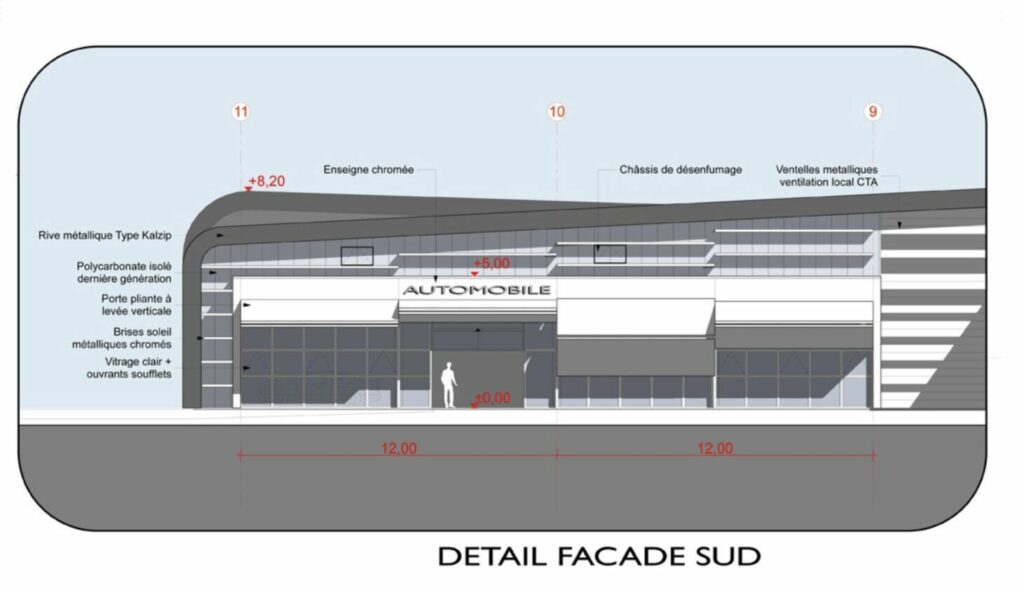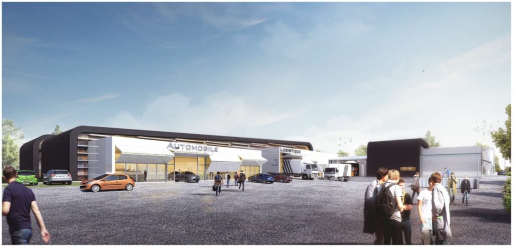 Compact, économique et mettant en valeur les pôles automobile et logistique, fers de lance du lycée, mais également des activités porteuses de notre région, notre parti architectural offre au Sud, côté ville et soleil, une cour de service pratique, ensoleillée et protégée des vents dominants, permettant des accès et des circulations aisés à tous les pôles en phase travaux et de façon pérenne durant la vie de l’ouvrage. L’extension, vitrine des techniques actuelles, mais sans ostentation, dispose d’une structure métallique poteaux-poutres en acier comme la structure du bâtiment F conservée, couverte de 2 rubans de métal laqué de couleur sombre à faible pente permettent de couvrir les 3 pôles H, D et G tout en respectant les hauteurs variées demandées au programme.